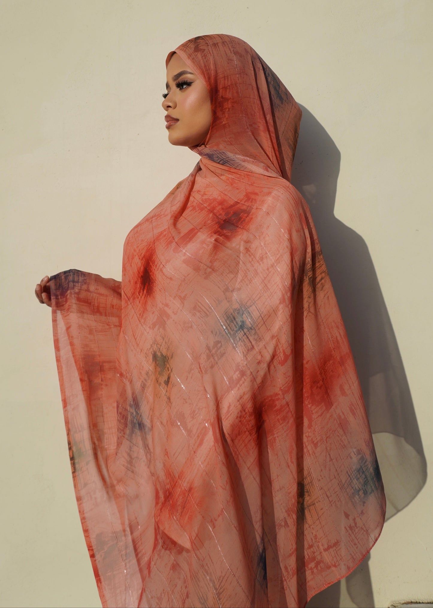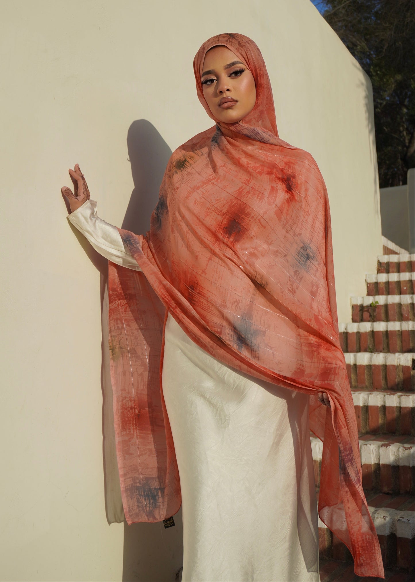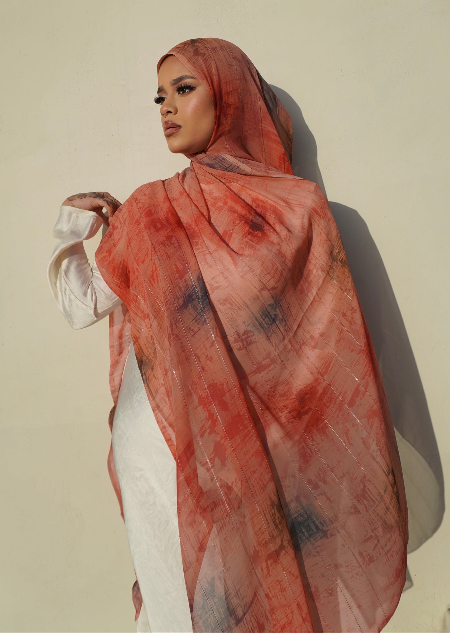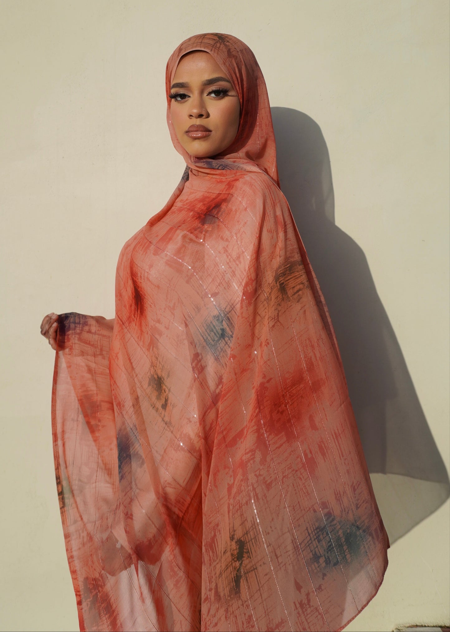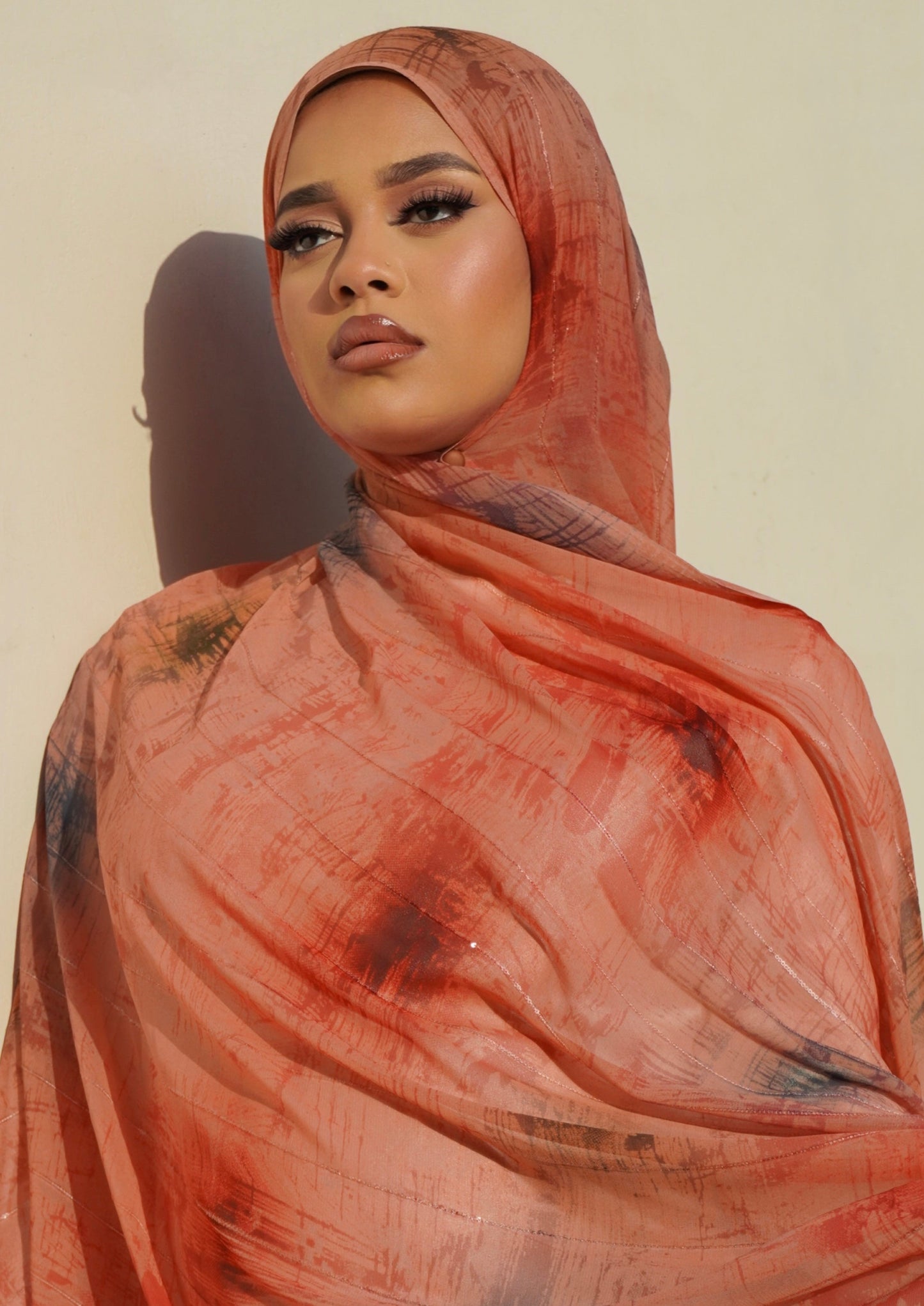 Our Blusheen print hijab features a stylish satin chiffon watercolor design and raw edges for a seamless lay. Perfect for staying on-trend while maintaining modesty.