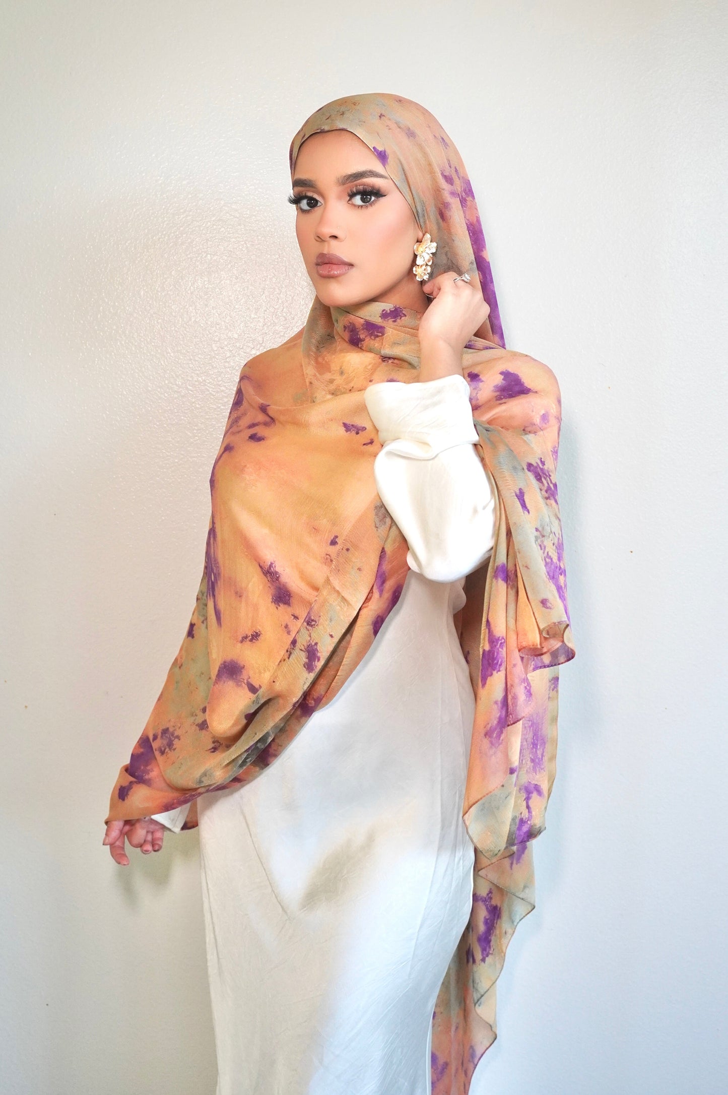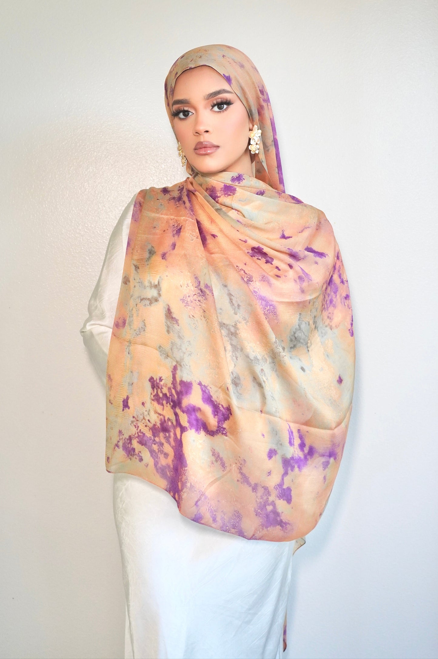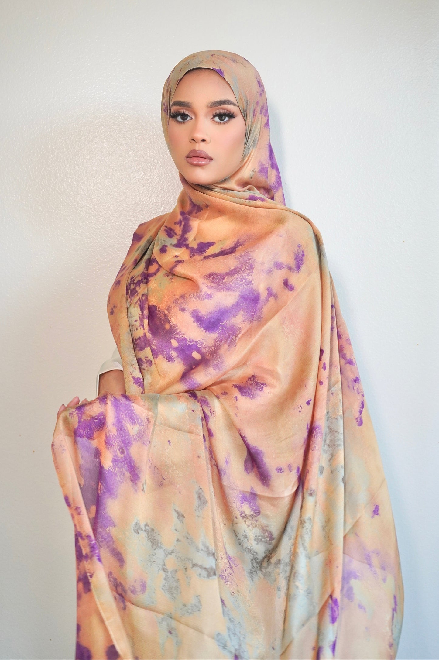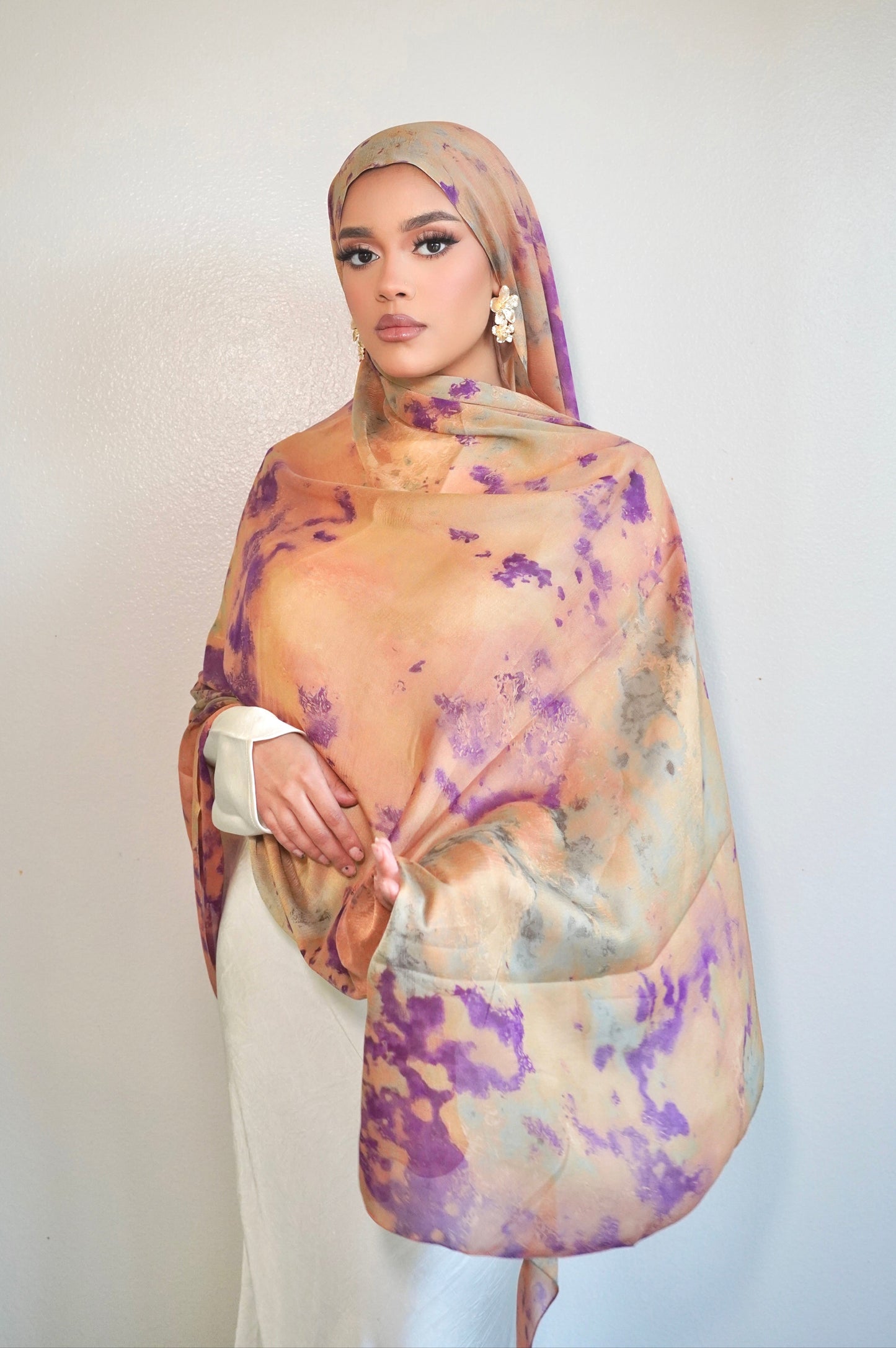 Our Aurora print hijab features a stylish satin chiffon watercolor design and raw edges for a seamless lay. Perfect for staying on-trend while maintaining modesty.