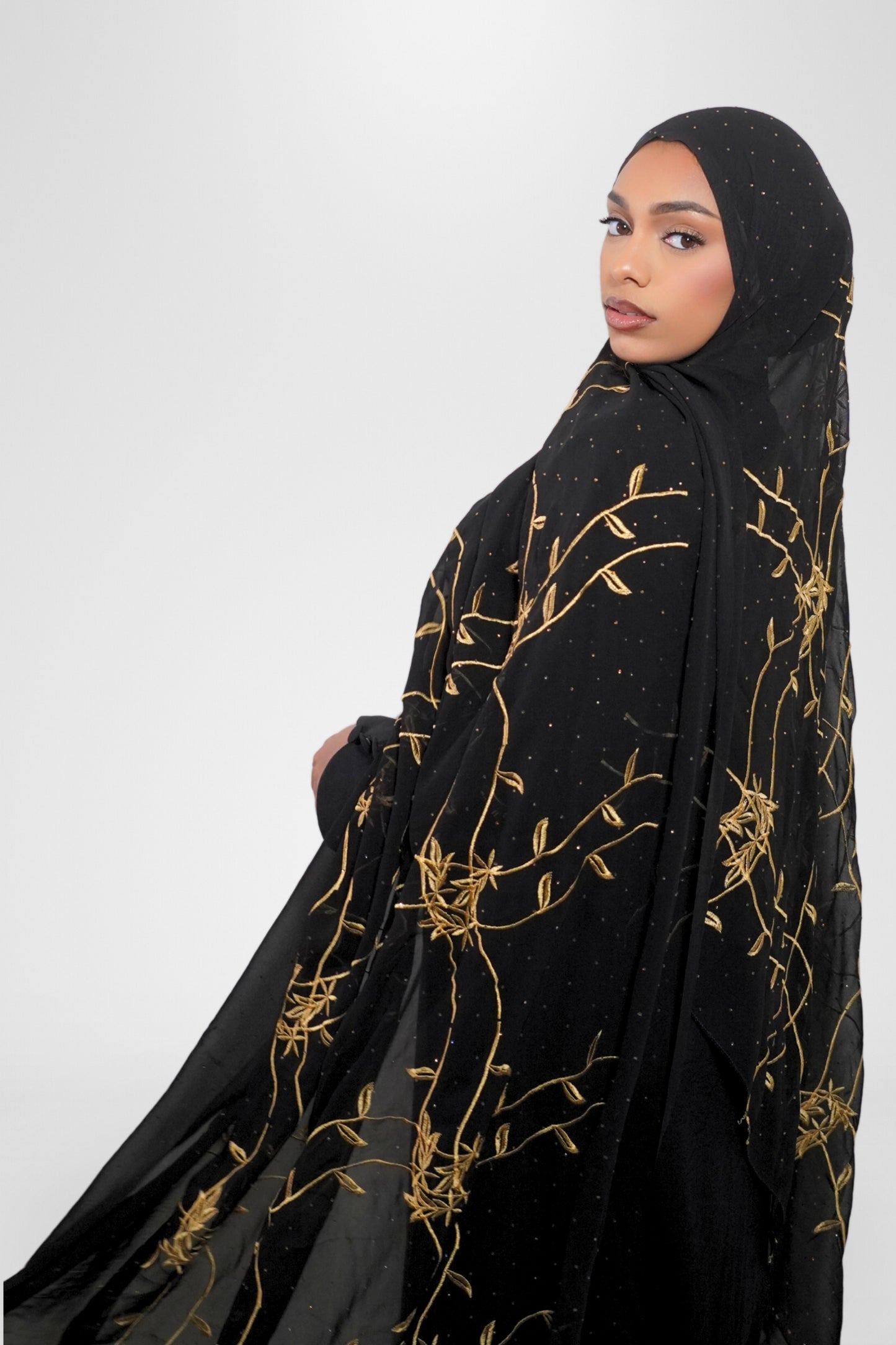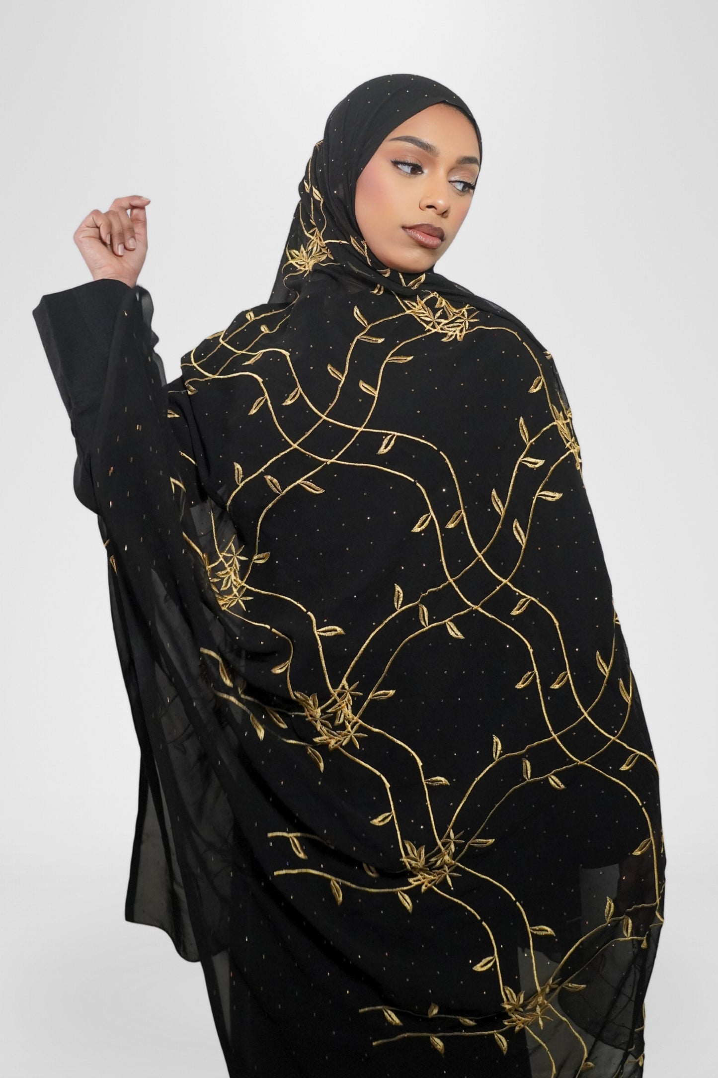 Elegant and timeless, this black chiffon hijab features intricate gold embroidery with delicate vine patterns and shimmering gold bead accents. Lightweight and breathable, it drapes beautifully for both everyday wear and special occasions, adding a touch of sophistication to any outfit.