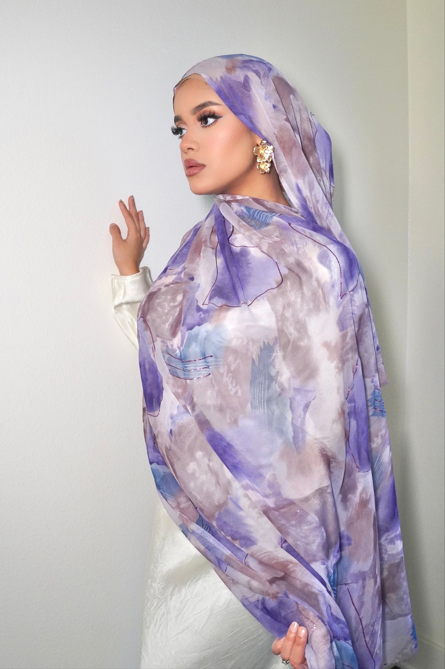 Our Elyssia print hijab features a stylish satin chiffon watercolor design and raw edges for a seamless lay. Perfect for staying on-trend while maintaining modesty.