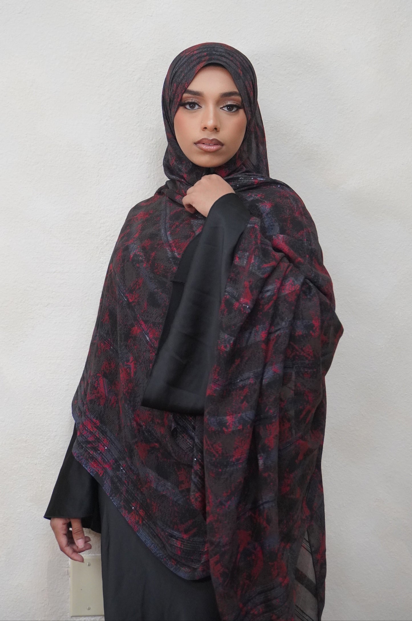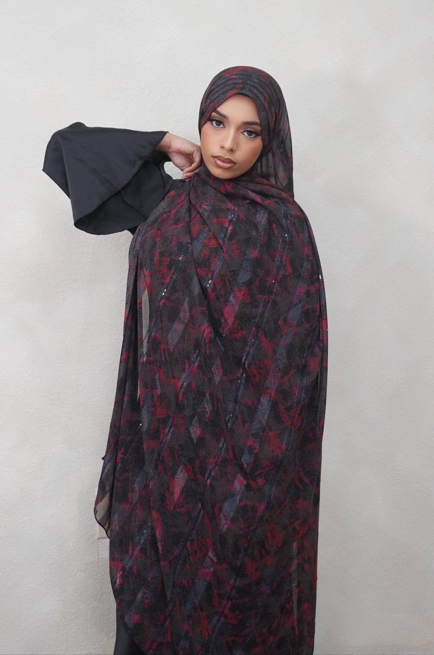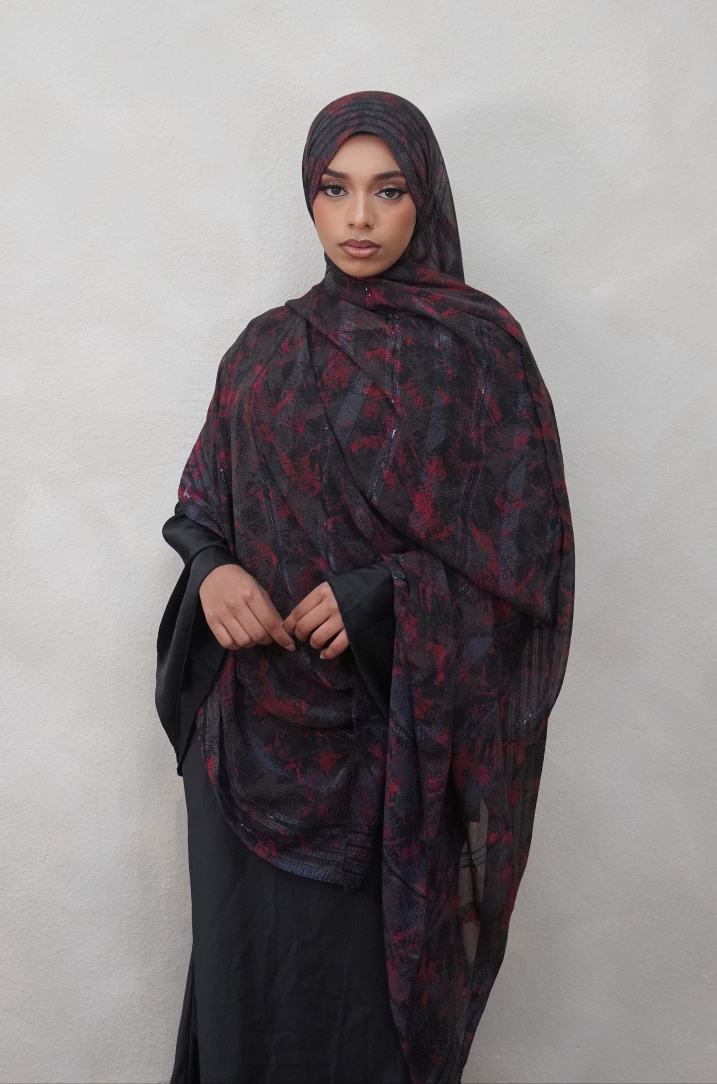 Our Noiréa print hijab features a stylish satin chiffon watercolor design and raw edges for a seamless lay. Perfect for staying on-trend while maintaining modesty.