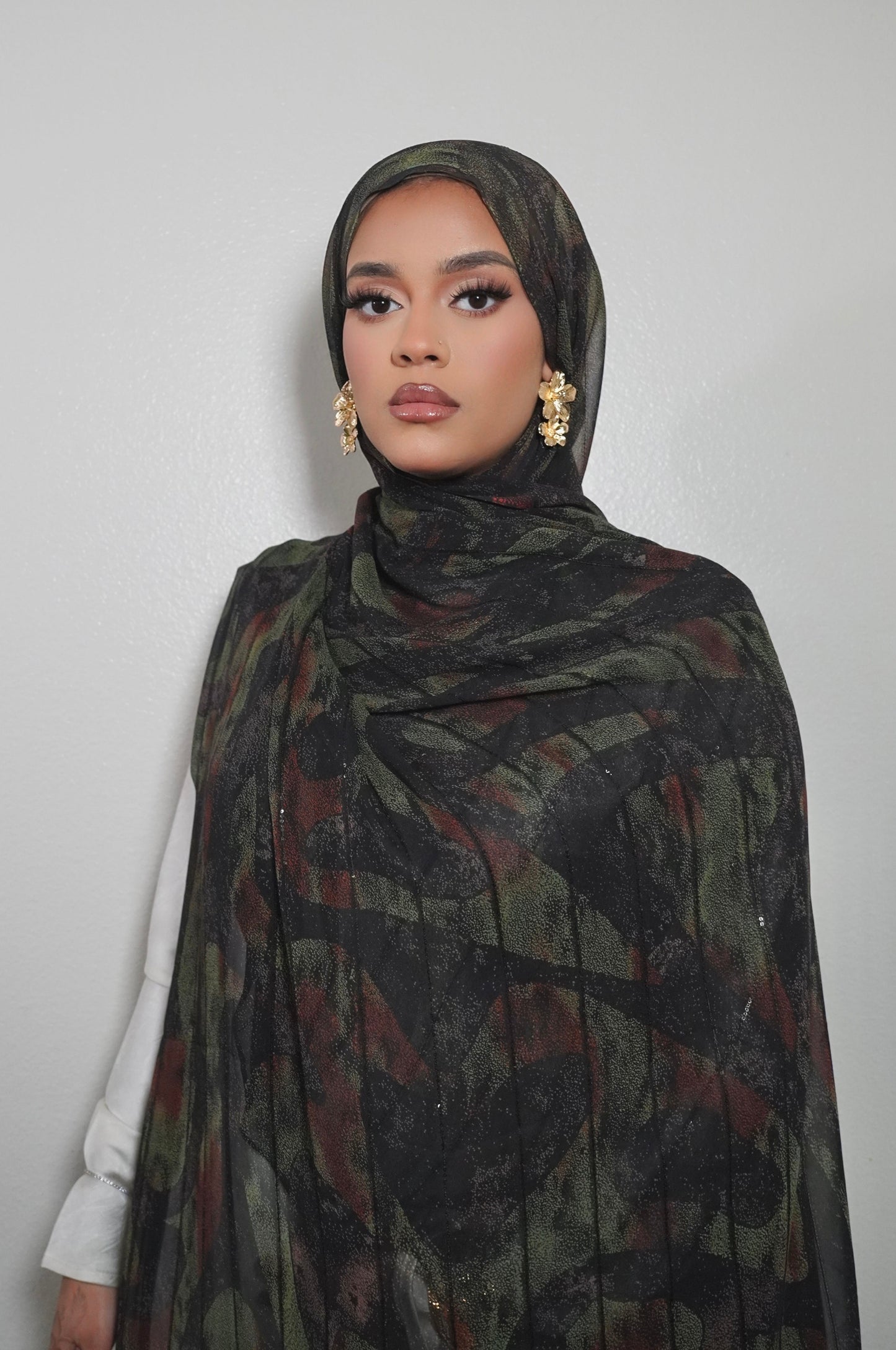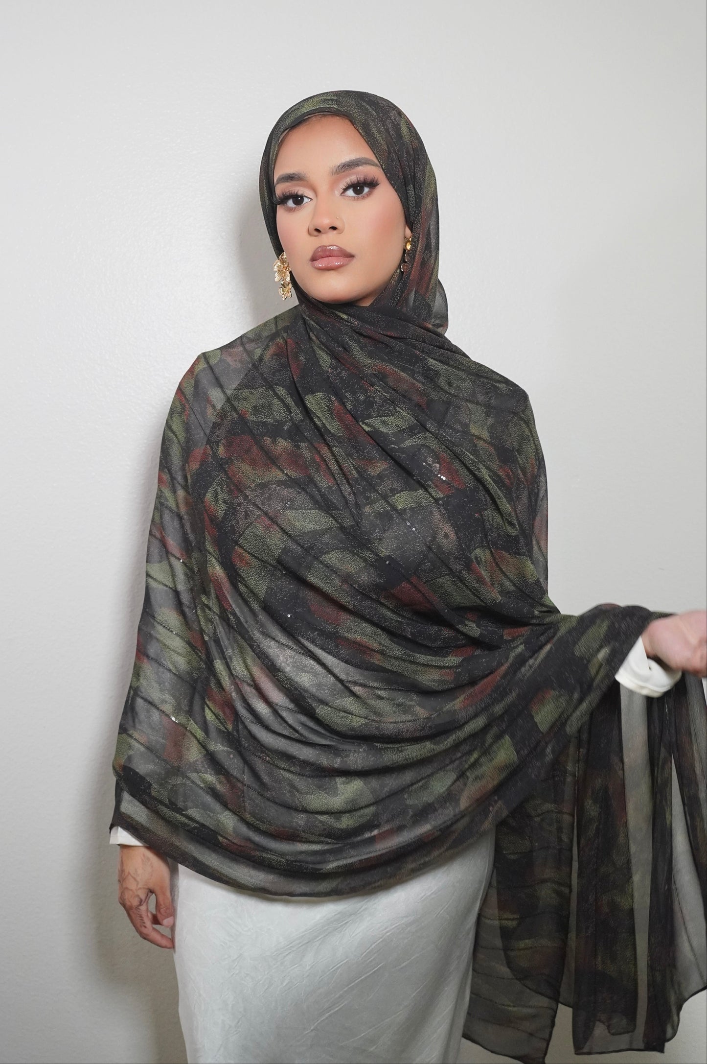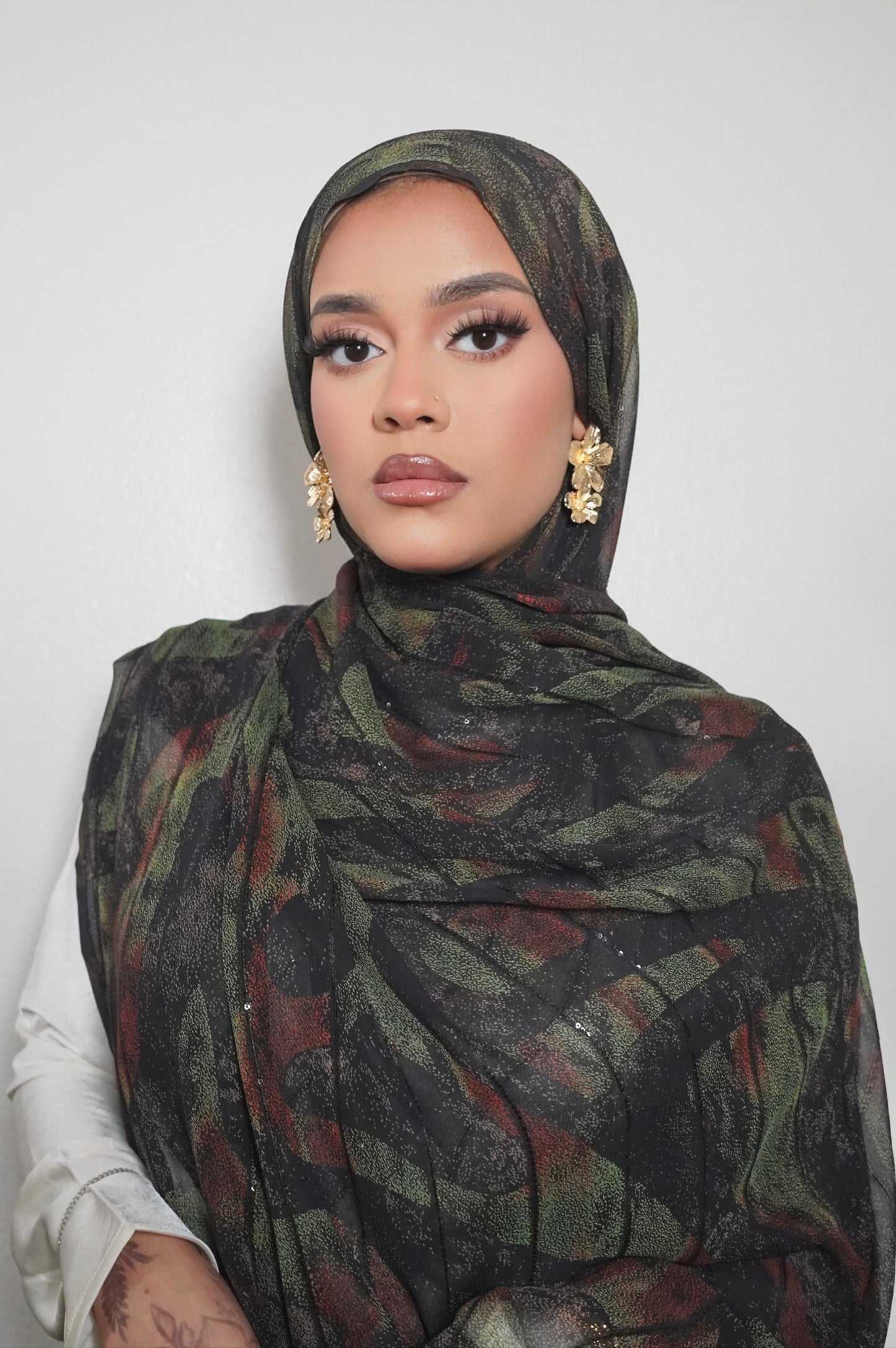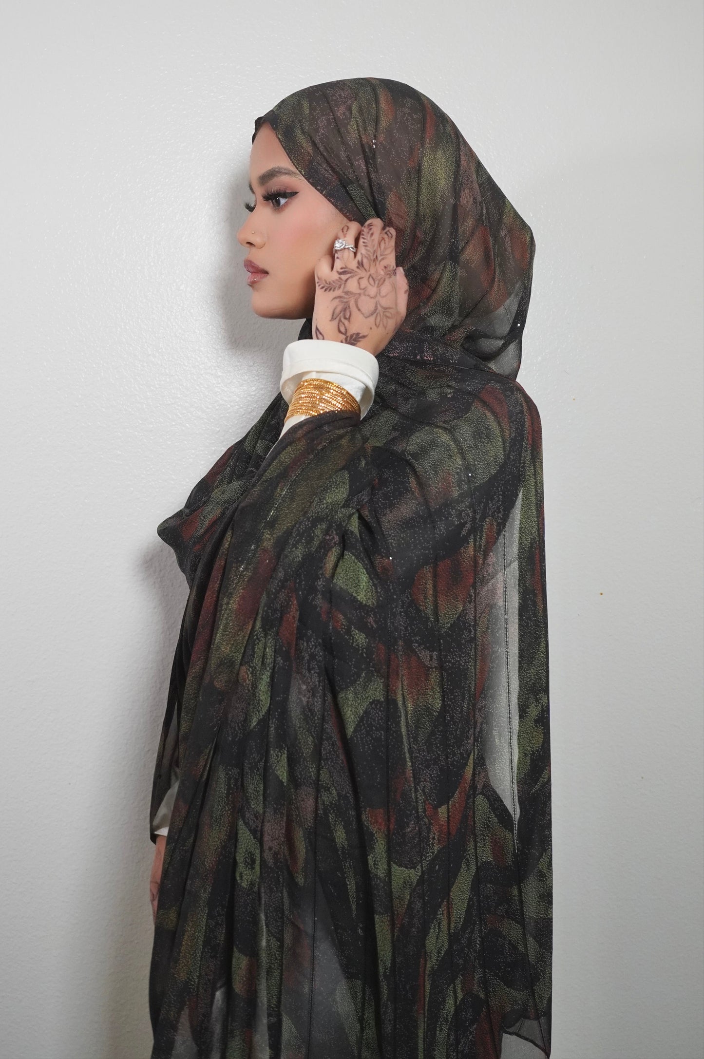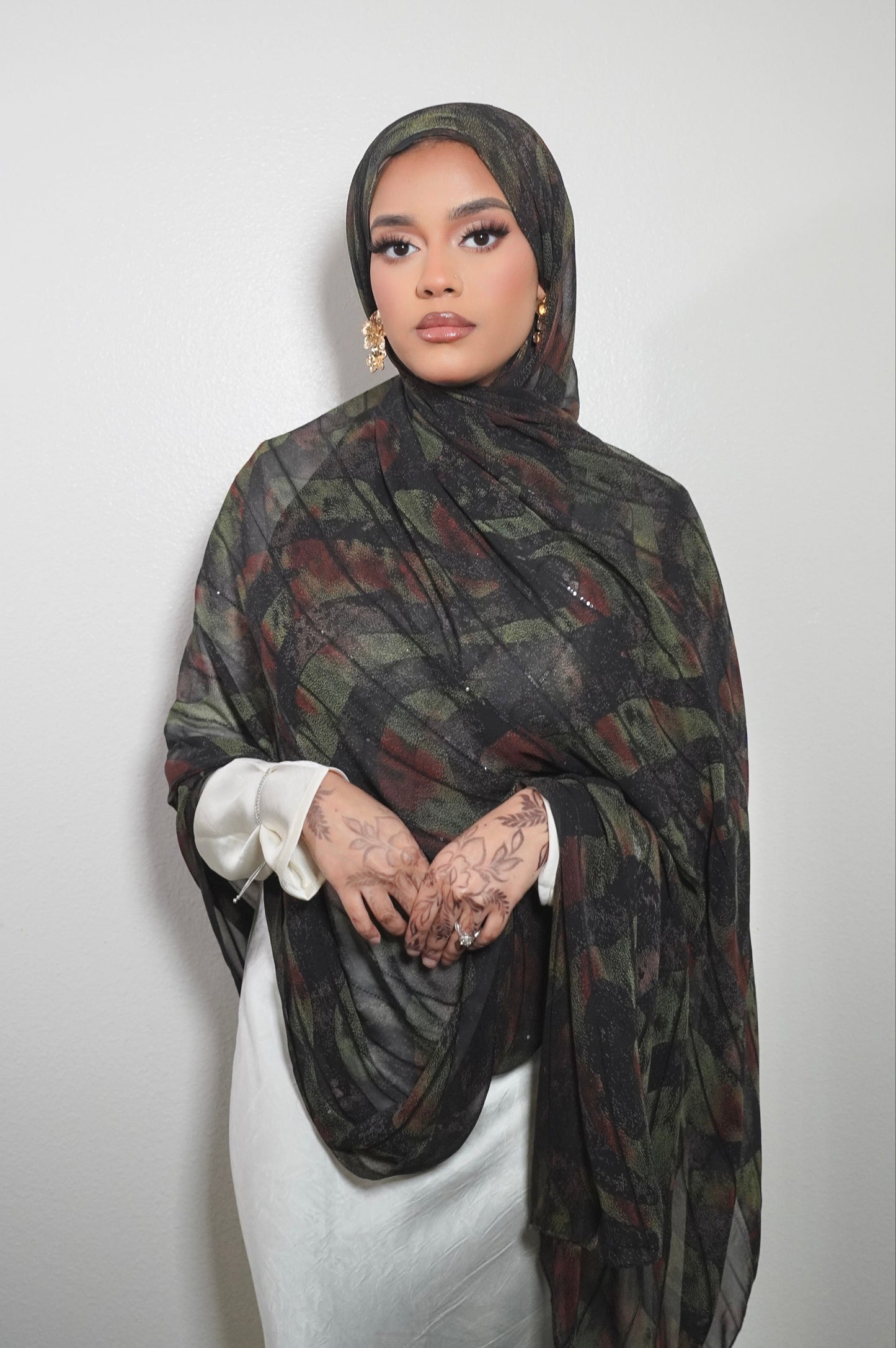 Our Raventra print hijab features a stylish satin chiffon watercolor design and raw edges for a seamless lay. Perfect for staying on-trend while maintaining modesty.