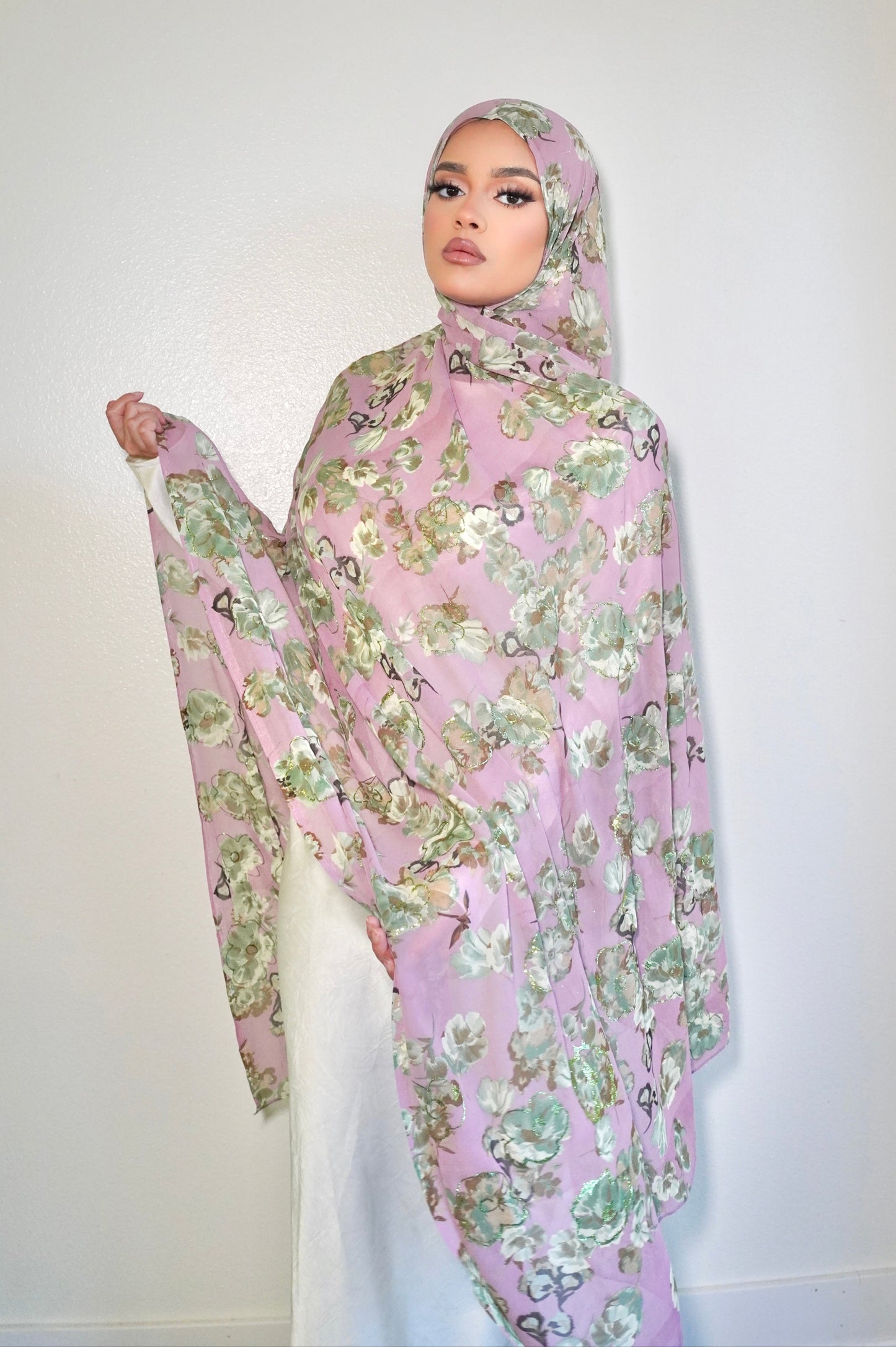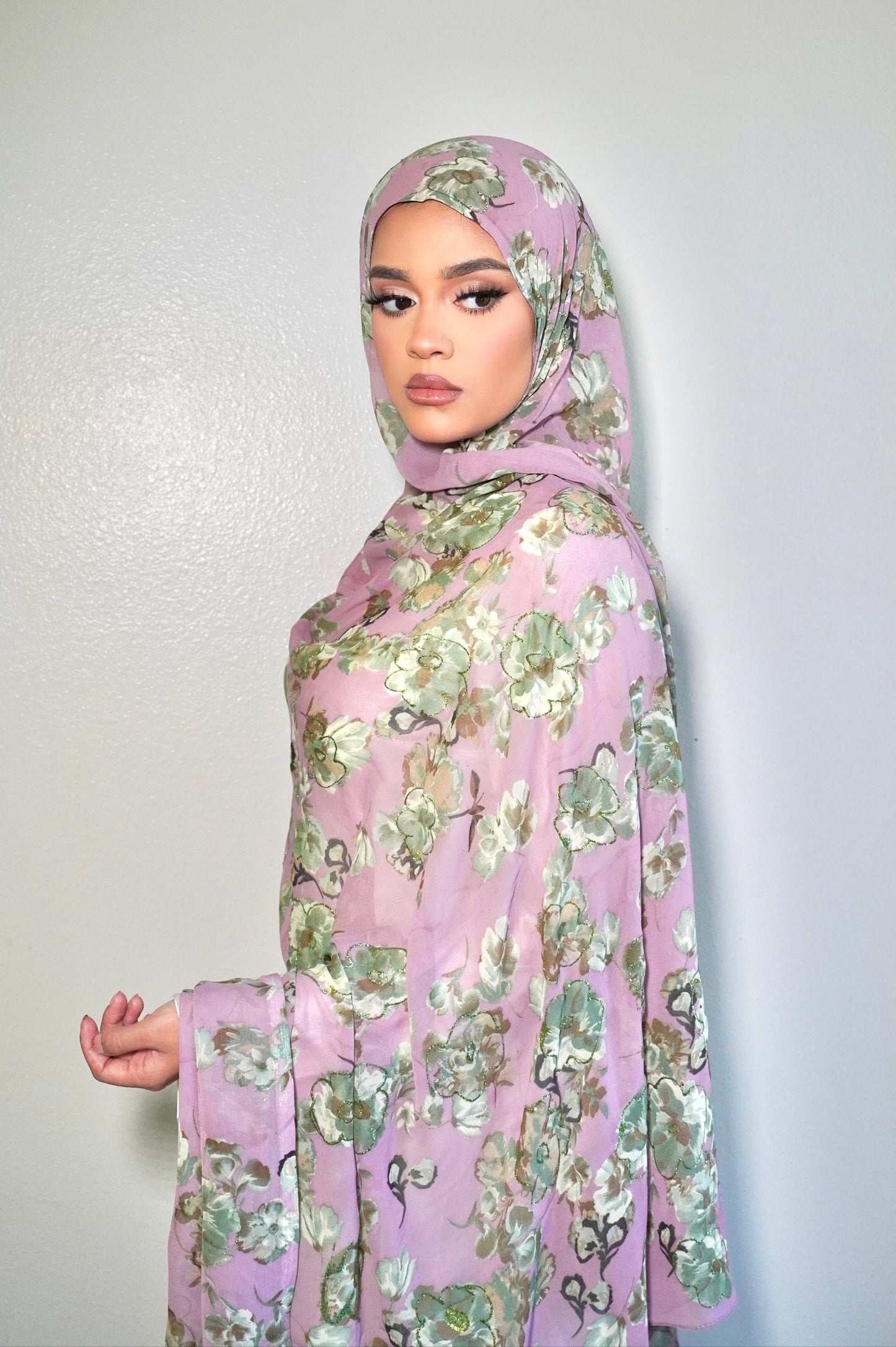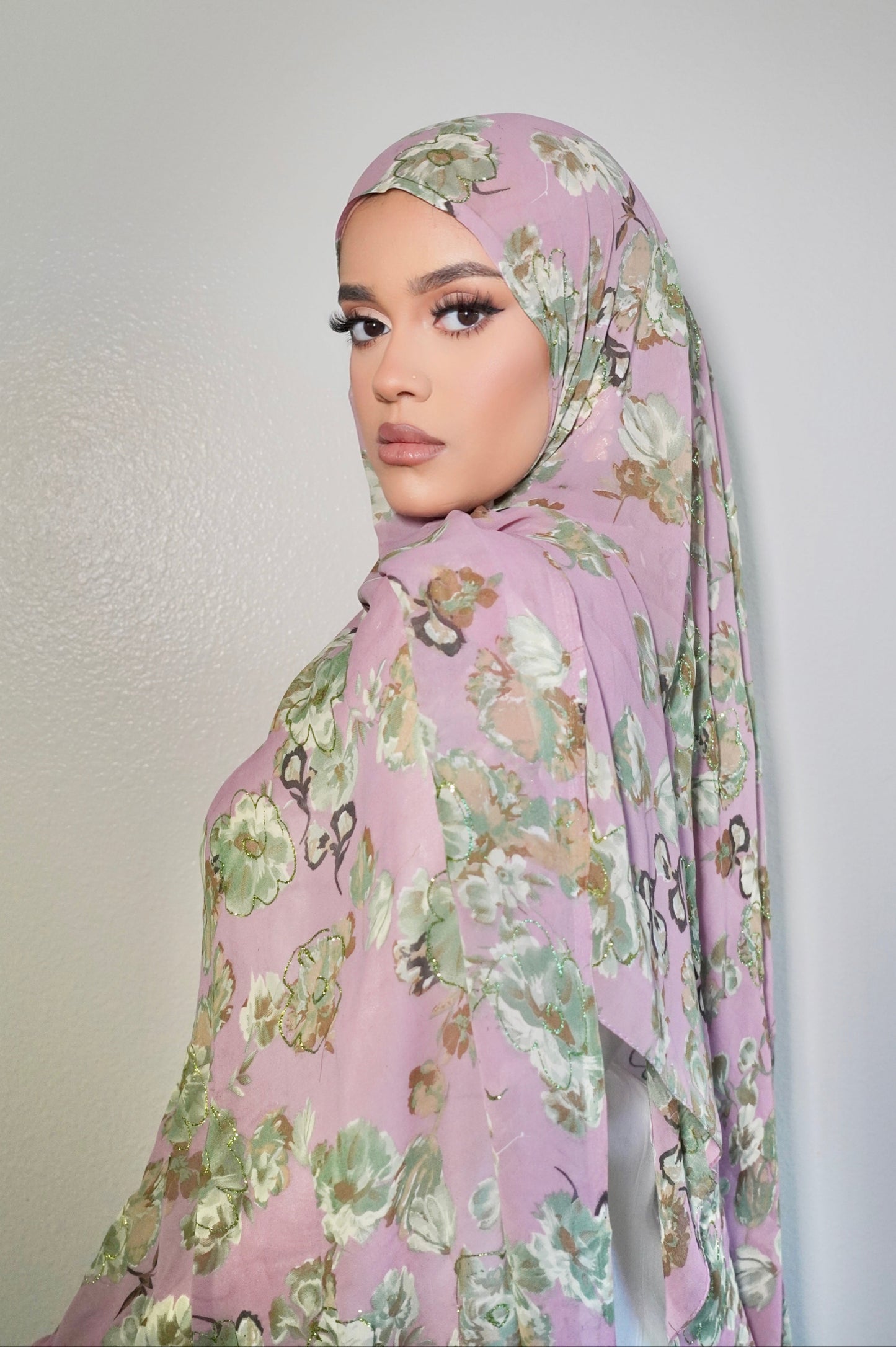 Our Rosmere print hijab features a stylish satin chiffon watercolor design and raw edges for a seamless lay. Perfect for staying on-trend while maintaining modesty.
