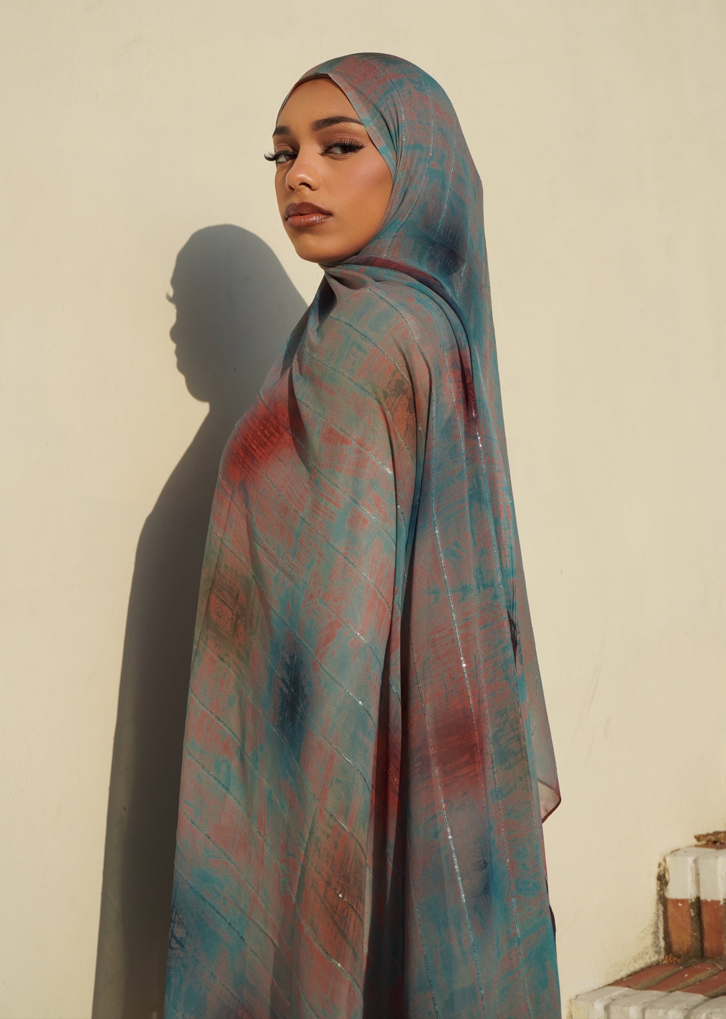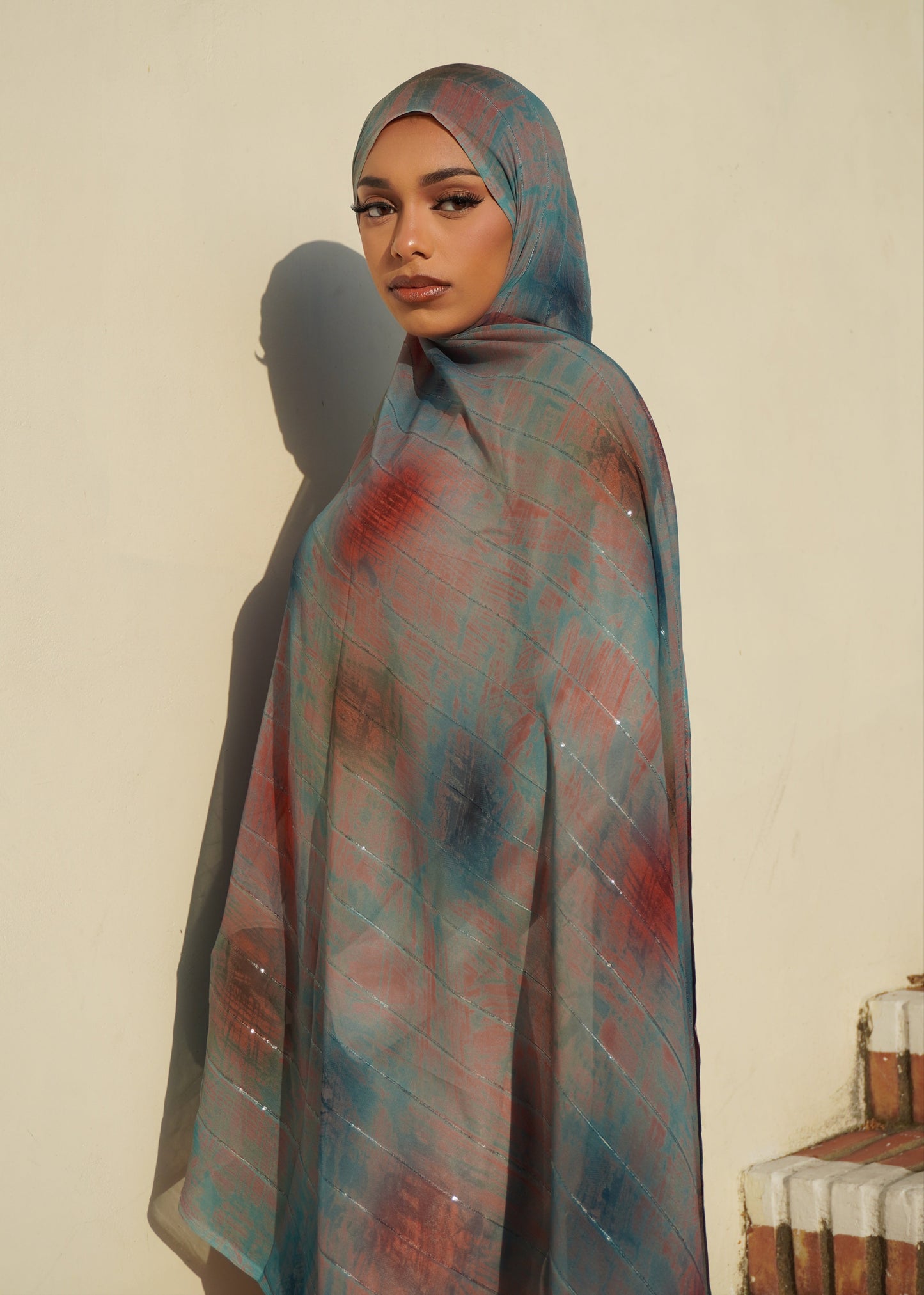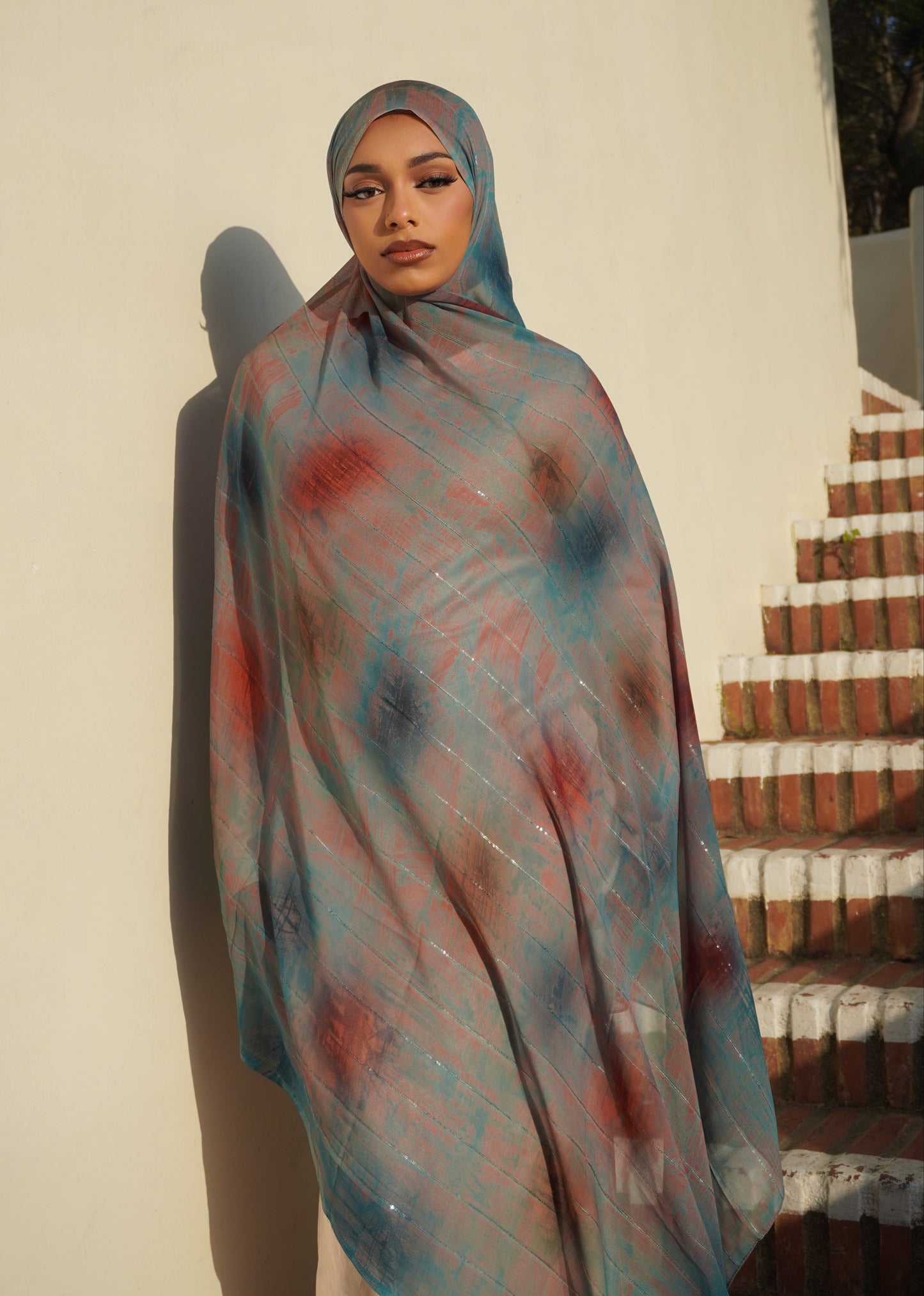 Our Seaflare print hijab features a stylish satin chiffon watercolor design and raw edges for a seamless lay. Perfect for staying on-trend while maintaining modesty.