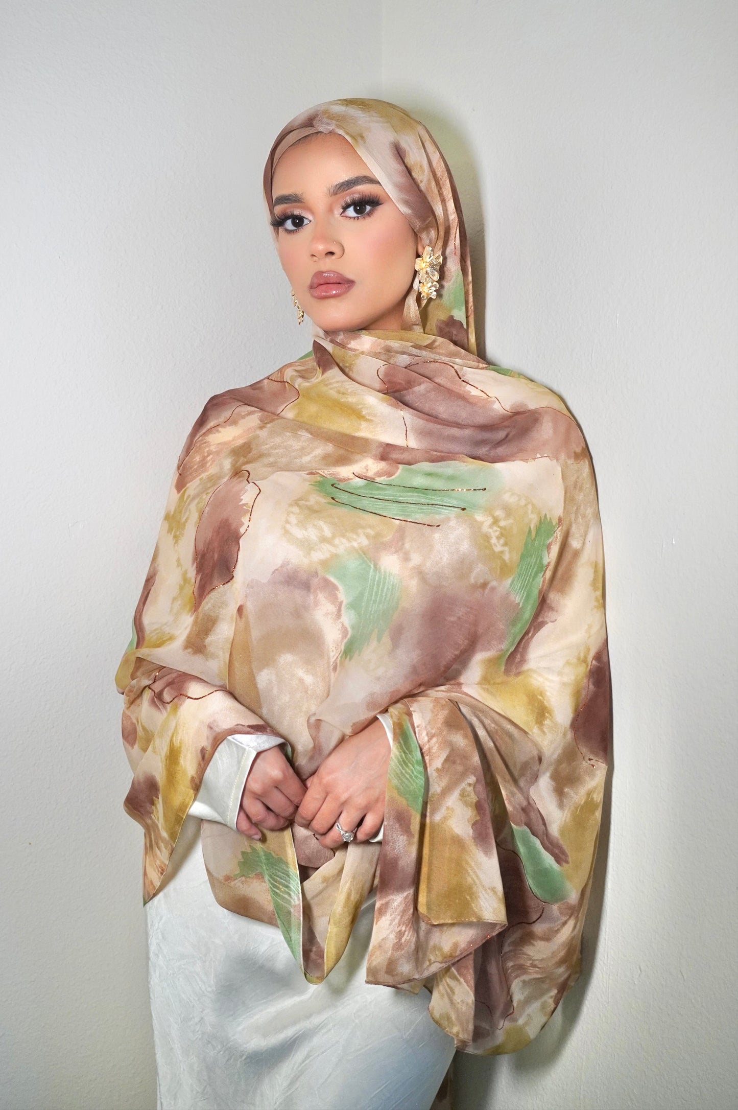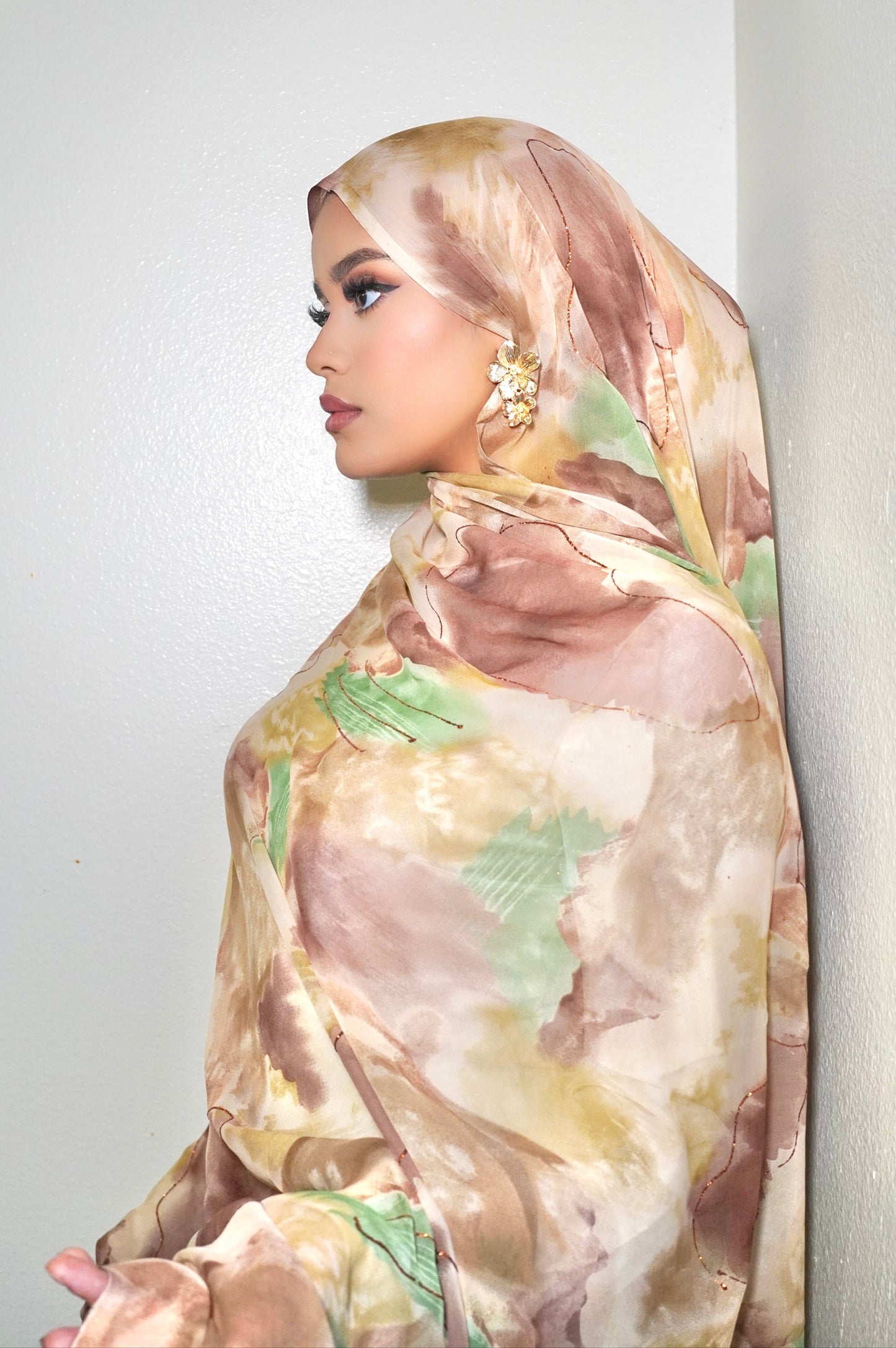 Our Serena print hijab features a stylish satin chiffon watercolor design and raw edges for a seamless lay. Perfect for staying on-trend while maintaining modesty.
